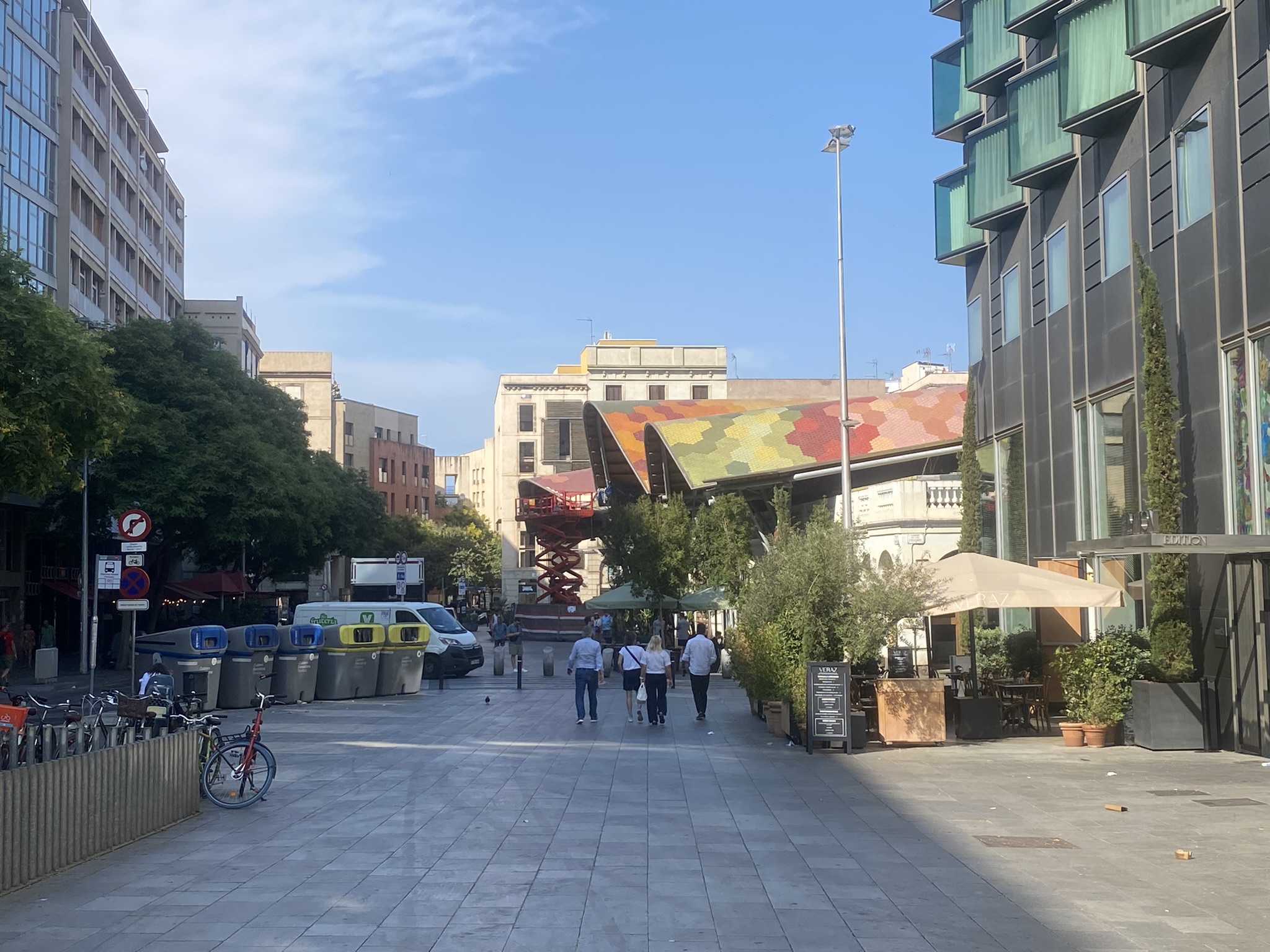 Since check-in wasn’t until 3 PM, I dropped off my luggage and wandered around the neighborhood. Barcelona’s grid-like city planning is famous, but what stood out to me even more was how walkable everything felt. The streets are wide, yet most are designated as one-way, leaving generous space for pedestrians and bikes. There are continuous bike lanes, shaded benches under the trees, and play areas for children scattered throughout the city.