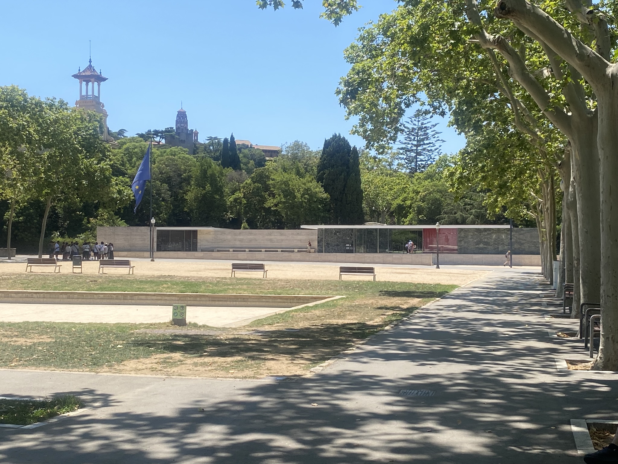 Exiting the metro, the view opened up dramatically. Ahead stood a grand, palatial building atop Montjuïc Hill, while remnants of the World Expo and Olympic Games lined both sides。 Among them, the Mies Pavilion. As one of Mies van der Rohe’s most iconic works, the original structure was dismantled after the 1929 exhibition, but was later faithfully reconstructed.