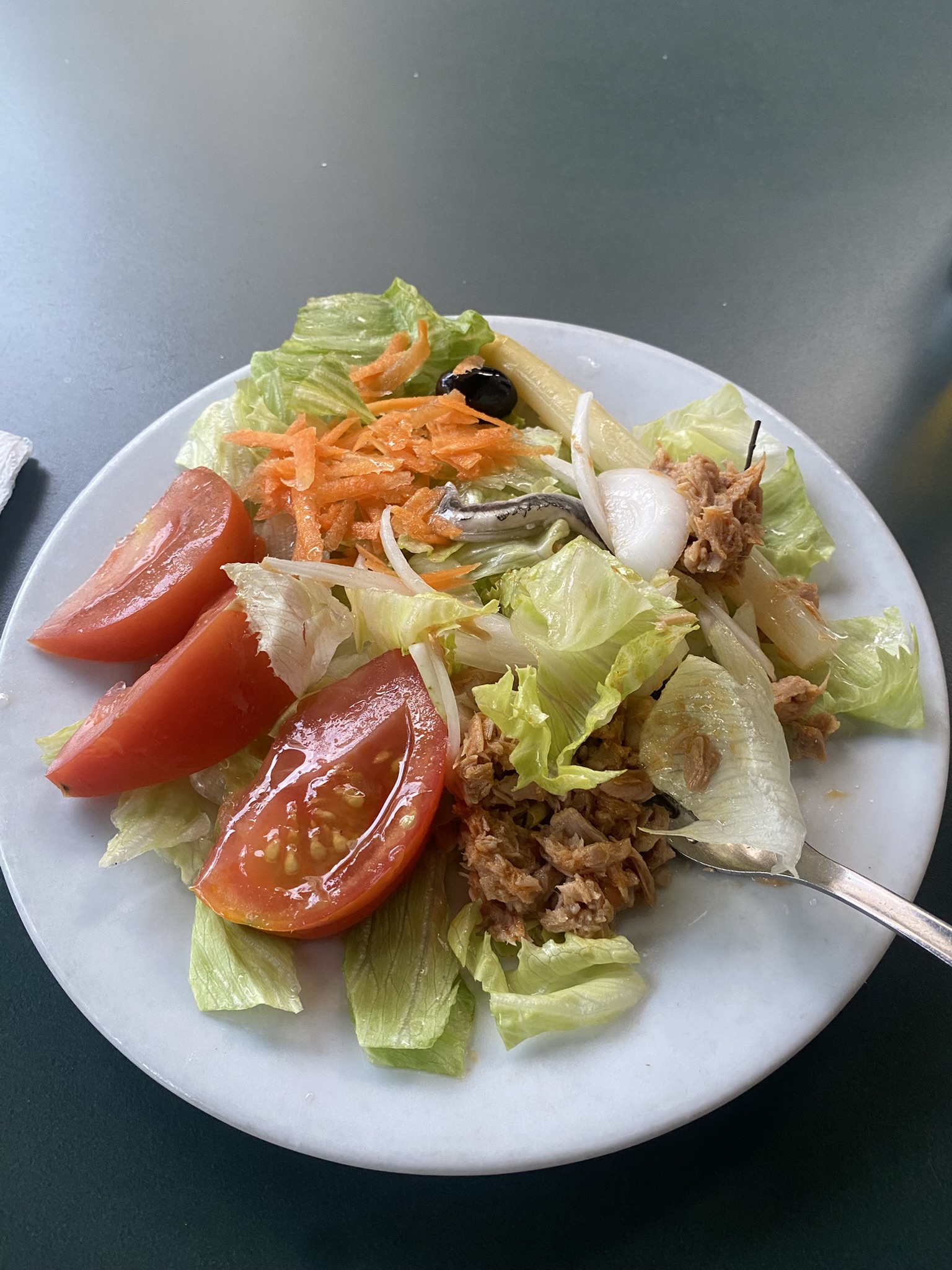 They serve a classic three-course Catalan home-style meal. I ordered the house salad, and it honestly blew me away: fresh, clean flavors, light yet well-balanced dressing, and a generous mix of ingredients. Quite possibly the best salad I’ve ever had. The main course was battered cod drenched in tomato sauce: crispy on the outside, tender and flavorful inside. And the dessert, a cheese pudding, was equally delightful.