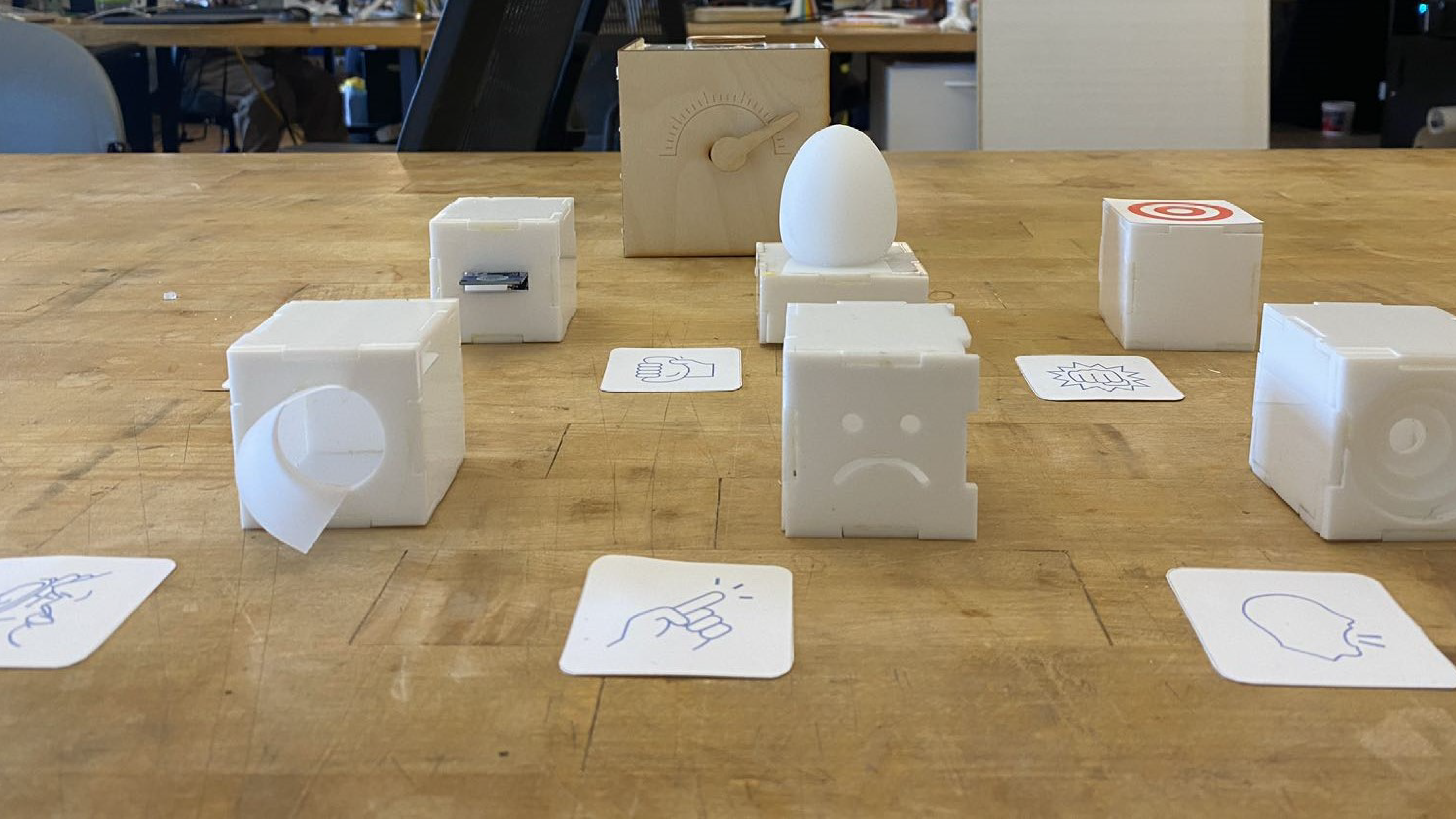 Moodie Assistant depicts the algorithm experience as an emotional response to hallucination. This prototype takes the form of a voice assistant with a gauge indicating the hallucination level. It’s equipped with a series of remotes to enable users/audiences to express their emotional experience during the conversation with different modalities and granularity on hallucination control. Different roles, users and audience, have different emotional reactions in their interaction with the devices. The prototype’s embodiment gives us the medium to discuss the interpretation ambiguity.