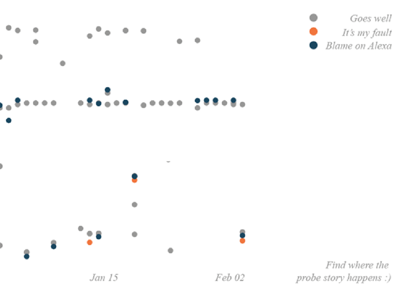 通过观察上述类别的数据,我开始会对这些对话的发生时间、频率随时间的变化以及对话发生后我对和Alexa 的态度和它对我的印象有何变化感到好奇。