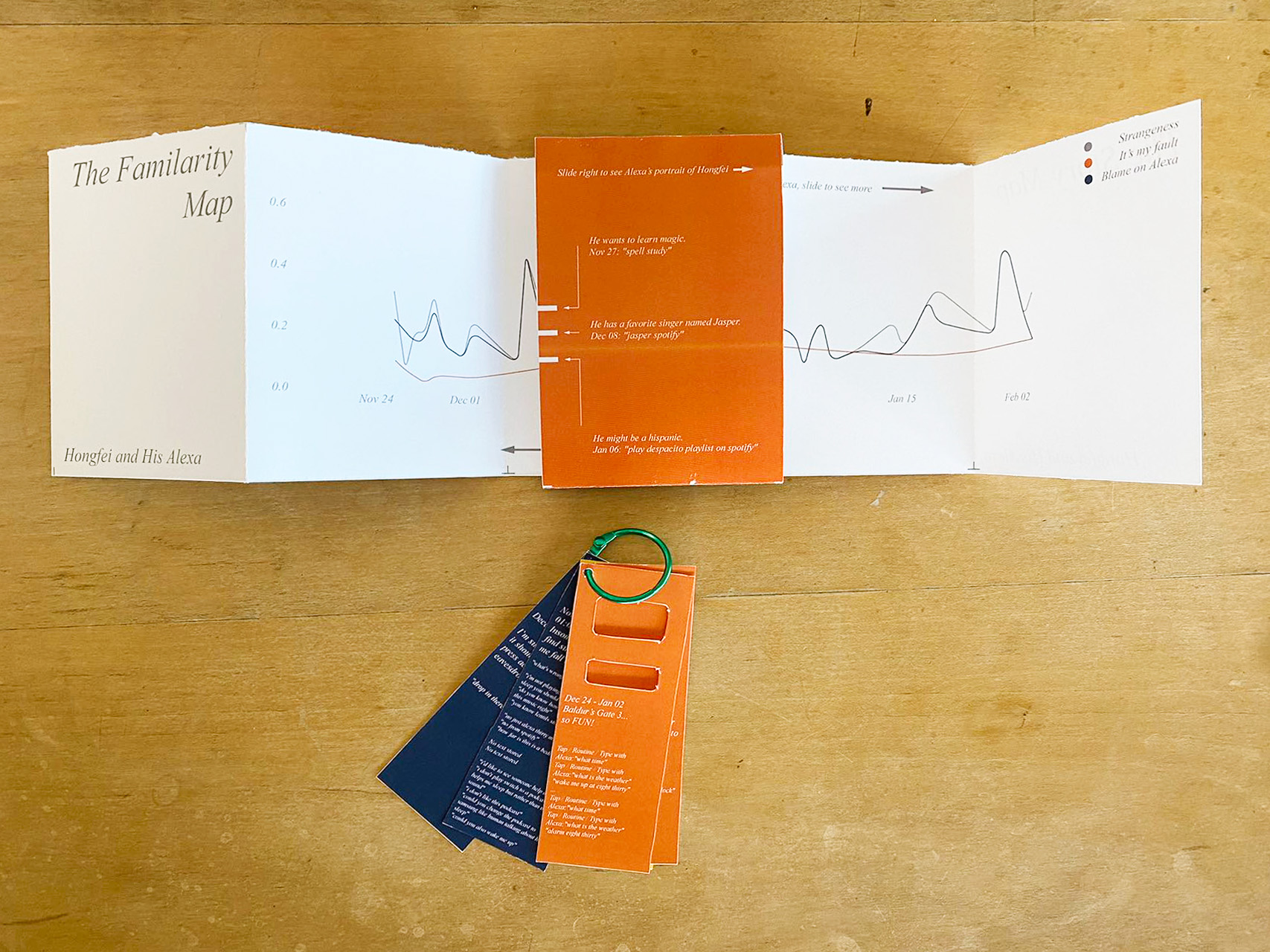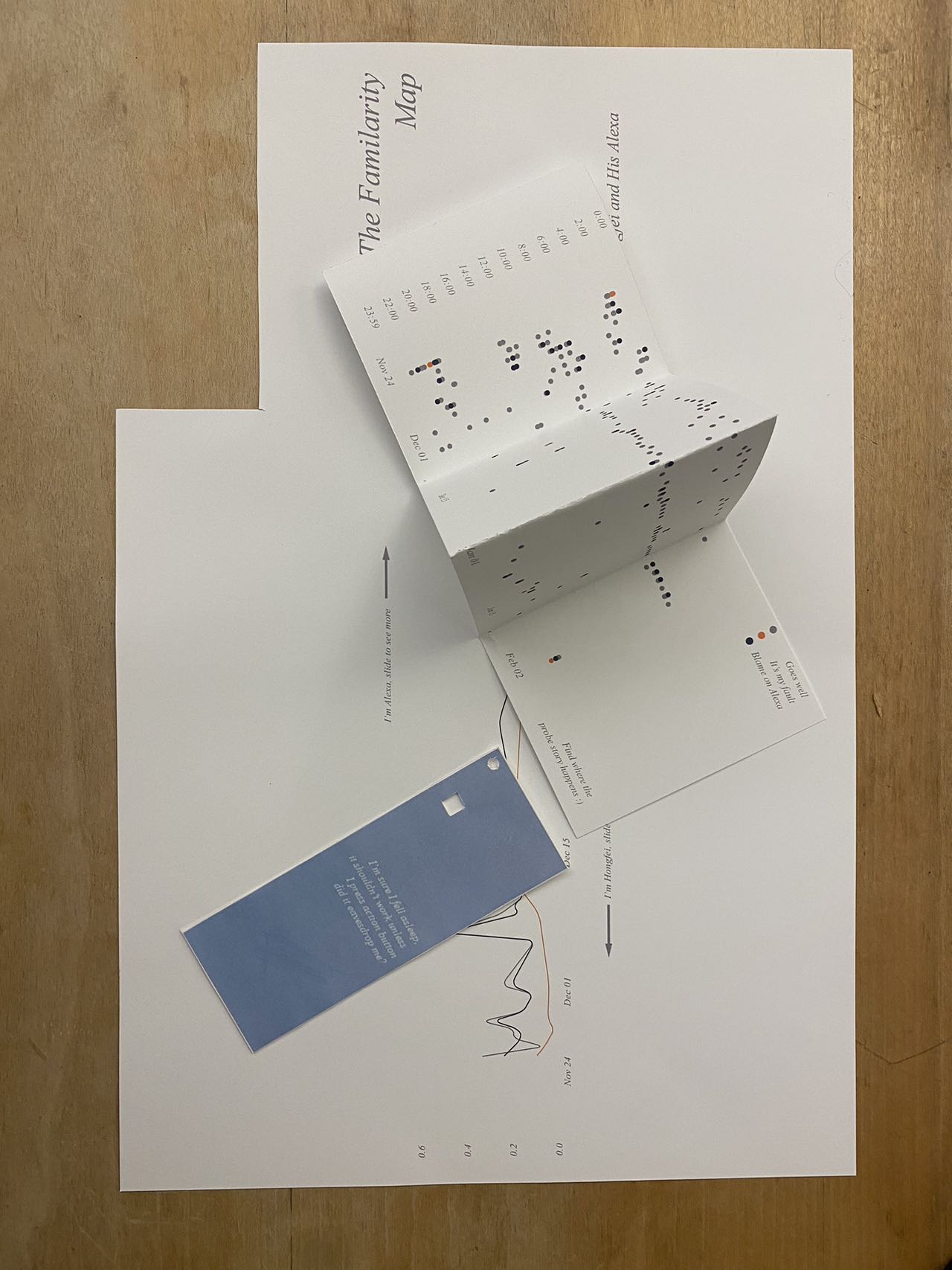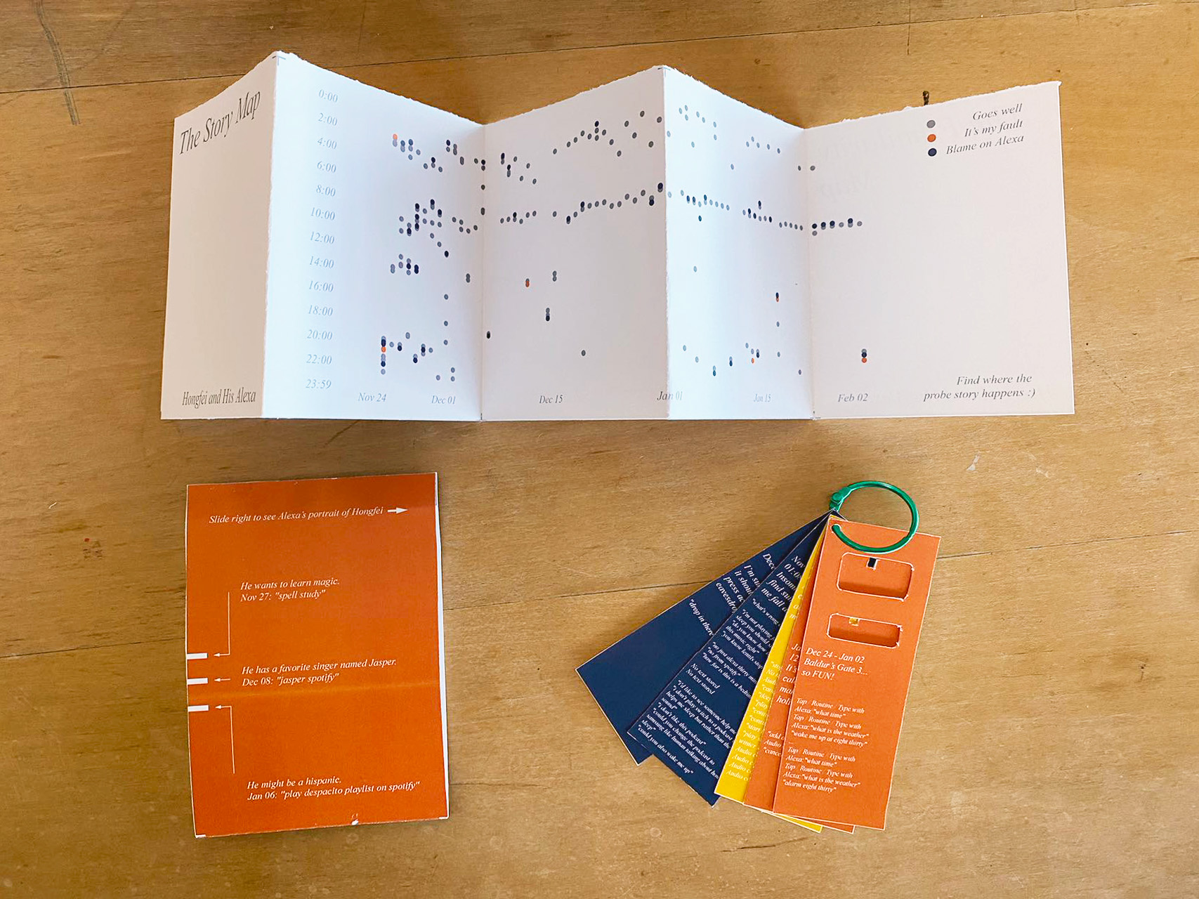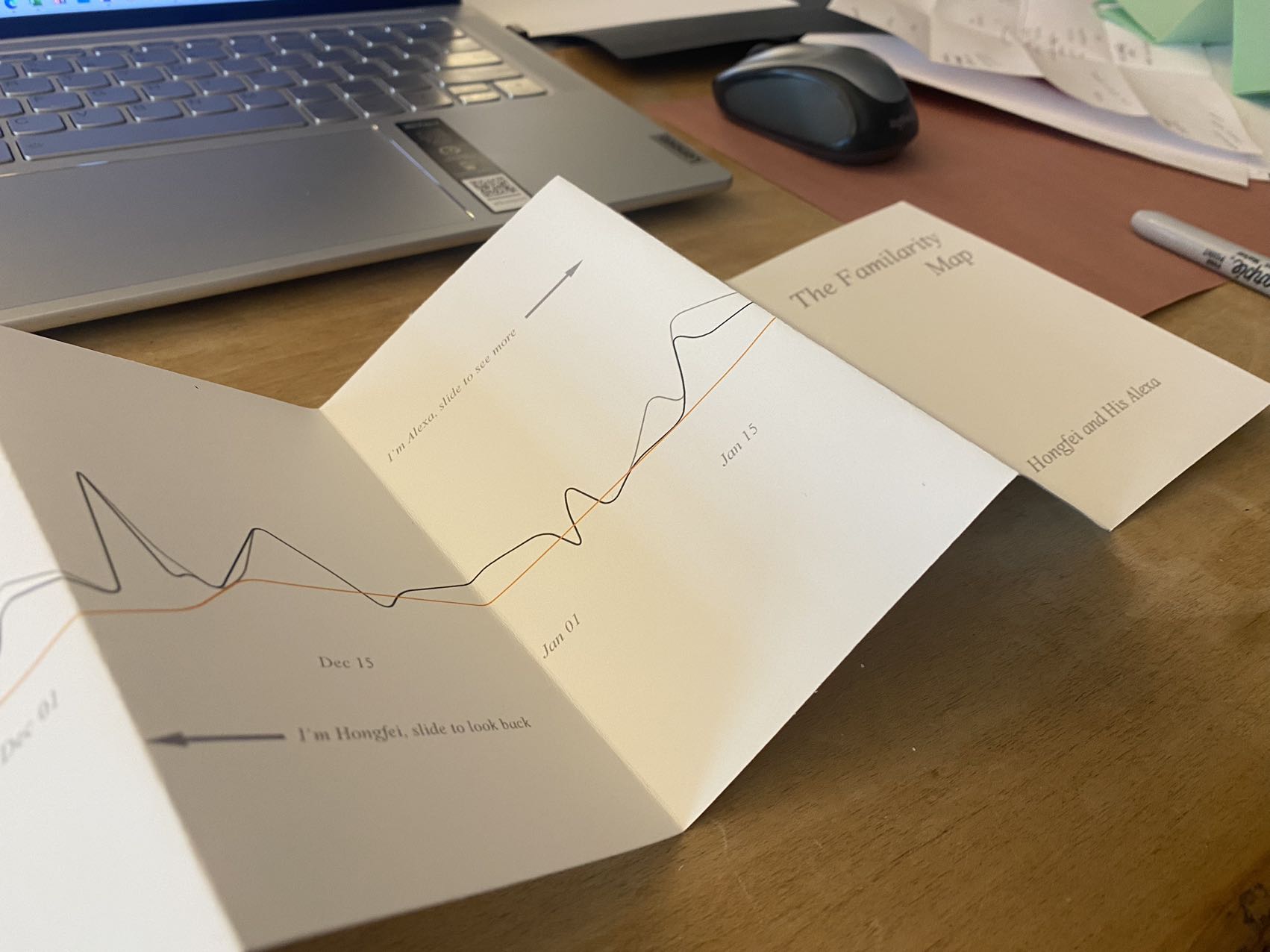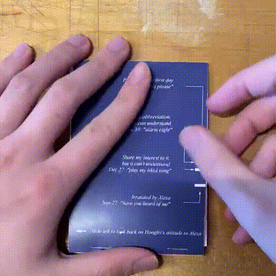 下图是上述迭代过程的高保真原型。 两种颜色代表了两个实体:我和 Alexa,也反映了一天中时间的流逝(白天和黑夜)。 封面被设计成一把尺子,上面标注了我对Alexa的关键的态度转变。 读者可以通过在手册上定位来探索这些转变,从而创造出一种引人入胜的自我引导体验。