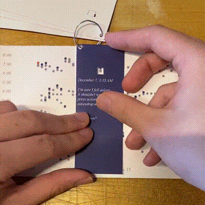 但过早地进行定量分析会抑制我的创造力,所以我试图通过浏览数据集和标注数据来想象这些趋势。在这个过程中,我发现自己就像一个侦探,对话的内容和时间唤醒了我当时的记忆。这些生动的回忆触动了我,因此我决定通过与手册的互动重现这种体验。