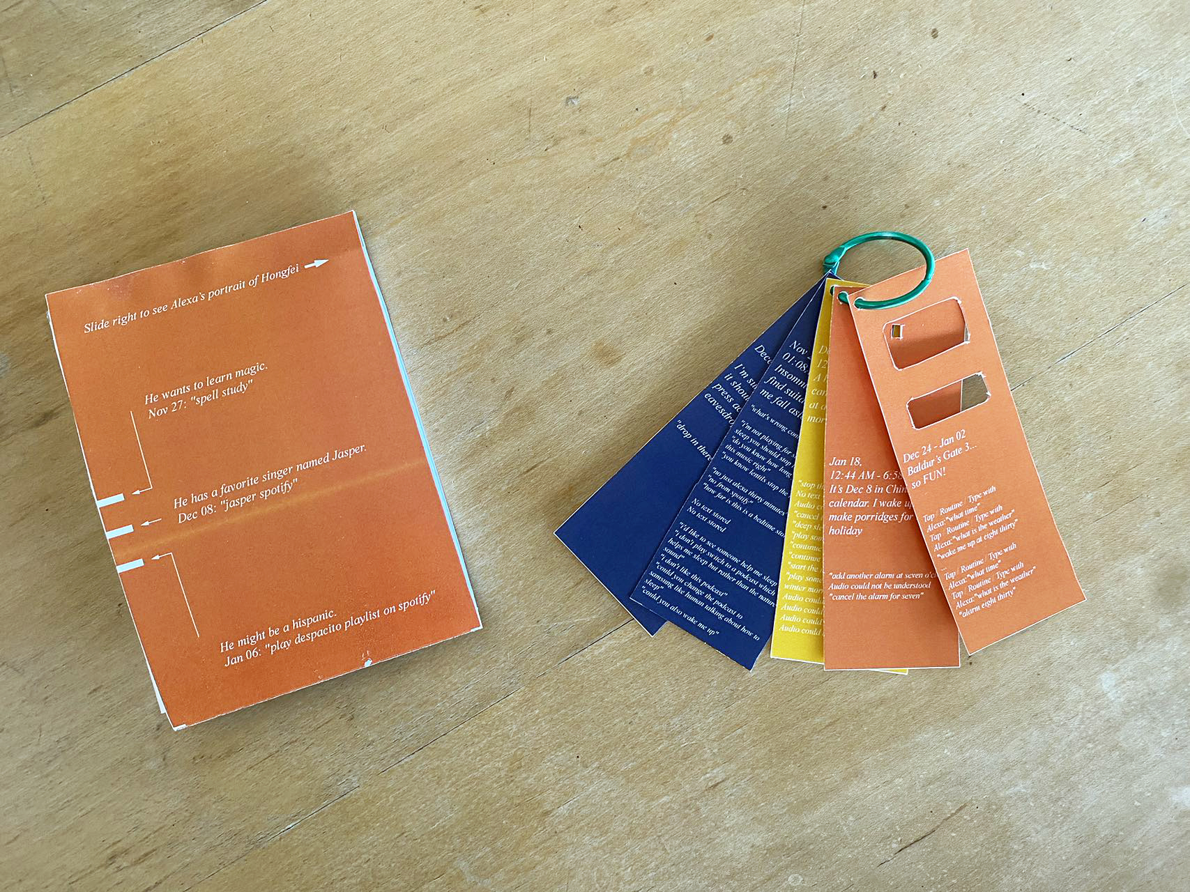 我选择了我与 Amazon Alexa 的对话记录作为制作这本手册的数据。我和三个室友合租,没有在房中安装智能家居设备。因此,我与它的交流大多是播放音乐和早期的闹铃。 虽然我和它相处了近一年,但其中的数据并不多。这次工作坊给了我一个很好的机会来反思我与它的关系 - 一个陪伴我度过无数日夜的伙伴。我在工作坊的前一天下载了数据,并将其处理成适当的格式:内容、日期和时间。